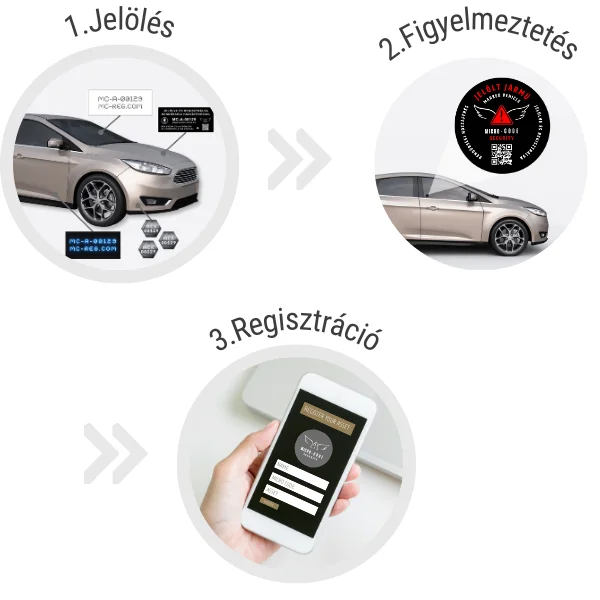 Első lépésben jelölünk, második lépésben felhívjuk a figyelmet a járművédelmi jelölésre. Harmadik lépésben nyilvántartásba vesszük az egyedi azonosító kódot, hogy a rendőrség ellenőrizni tudja.