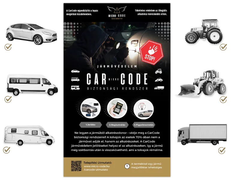 A lopott járművek 70%-át bontott alkatrészként értékesítik. Lehet a járműnek rendszáma, és motorszáma, – de a többi alkatrész nincs jelölve. Ebben segít a CarCode, és így lesz értéktelen a jűrmű a tolvajok számára.
