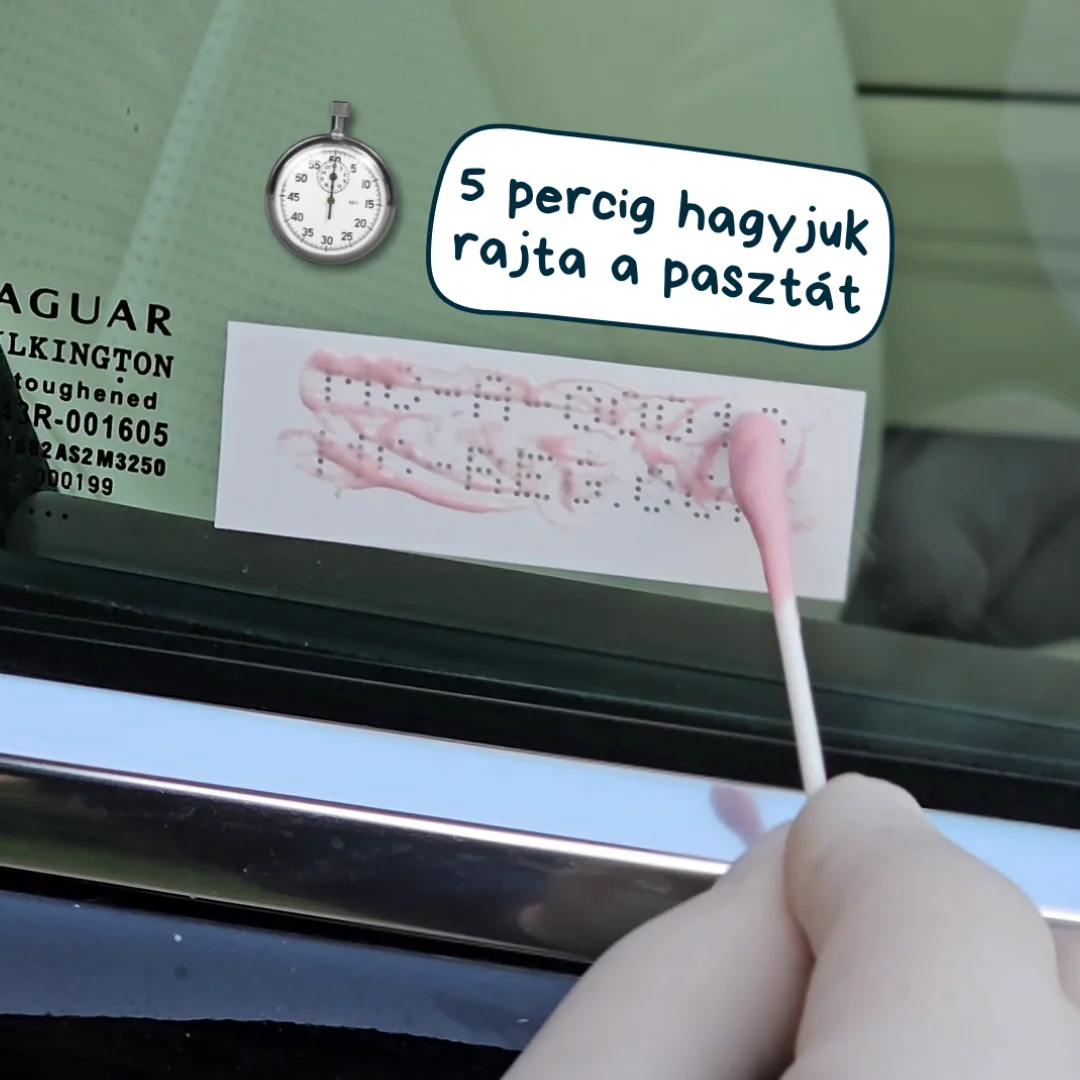 c) Nyissa ki a paszta tubusát, (használjon védőkesztyűt) mártsa bele a vattapálcát, keverje el alaposan, és óvatosan kenje fel a pasztát a sablonra. Minden számot és betűt teljesen fedjen be, és közben ügyeljen arra, hogy a paszta ne érintse az üveg többi felületét a sablon körül. Hagyja a pasztát 5 percig hatni.