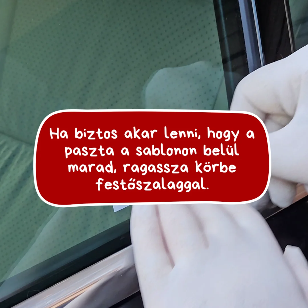 b) Távolítsa el a sablon fehér hátlapját. Ragasztja fel a sablont az üvegre, és erősen simítsa rá a hátlap segítségével. Amennyiben biztos szeretne lenni abban, hogy a paszta nem jut a sablonon kívüli területekre, ragassza körbe a sablont festőszalaggal vagy maszkolószalaggal.