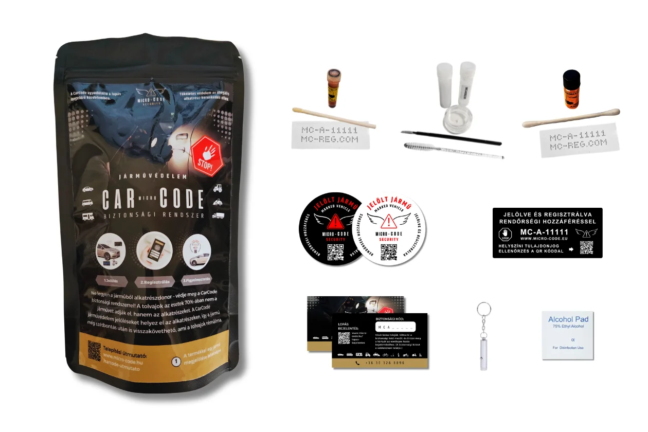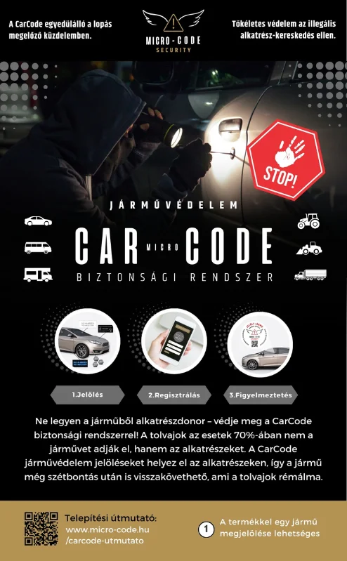 Ne legyen a járműből alkatrészdonor – védje meg a CarCode biztonsági rendszerrel! A tolvajok nem a járművet adják el, hanem az alkatrészeket. A CarCode járművédelem rejtett jelöléseket helyez el a járművön, így az alkatrészek még eladás után is visszakövethetők. A tolvaj többé nem alhat nyugodtan, mert többé nem igaz, hogy alkatrész eladás esetén nem lehet bizonyítani a lopást.